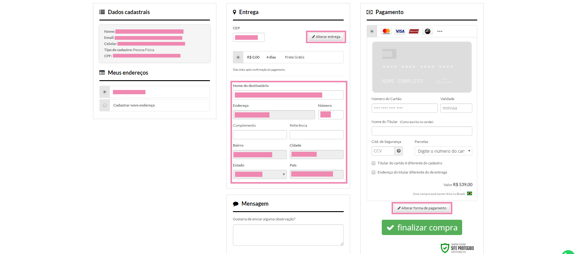 Agora vamos para a parte final! Você pode escolher a entrega, verificar os prazos estimados e selecionar a forma de pagamento! Certifique-se que inseriu o endereço correto!